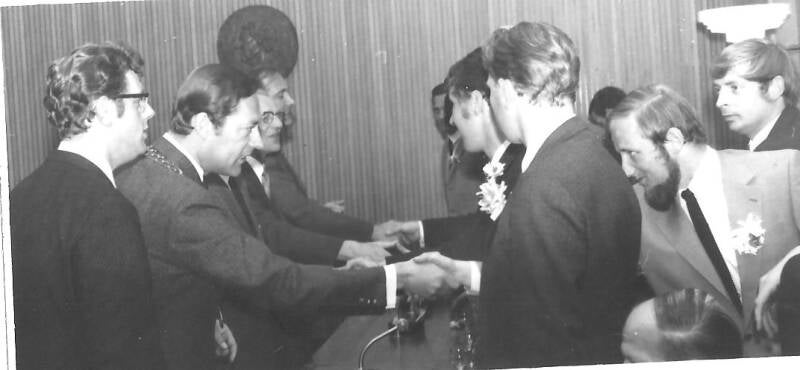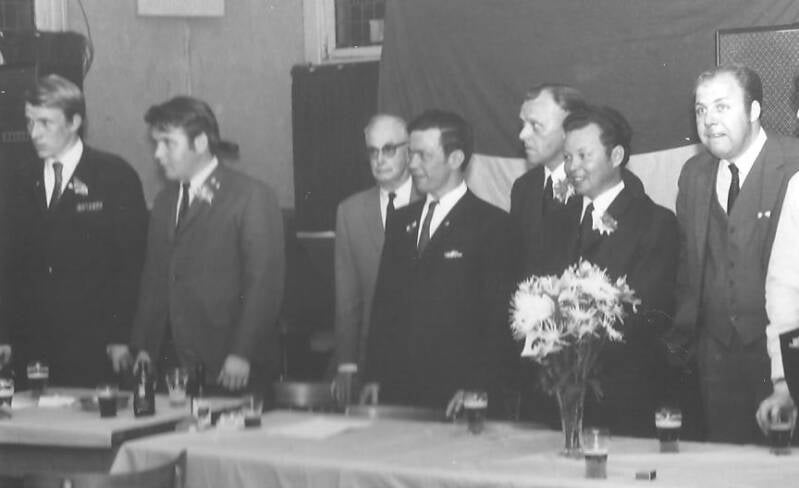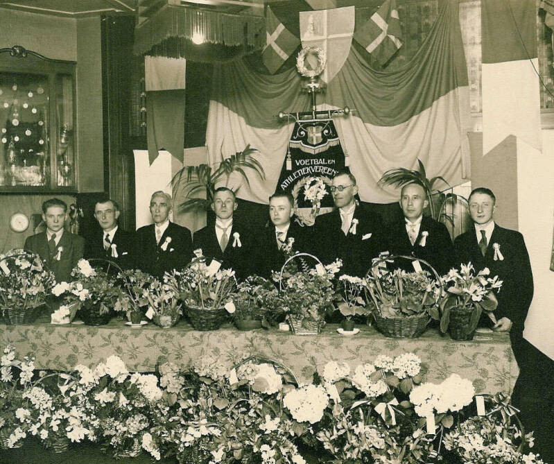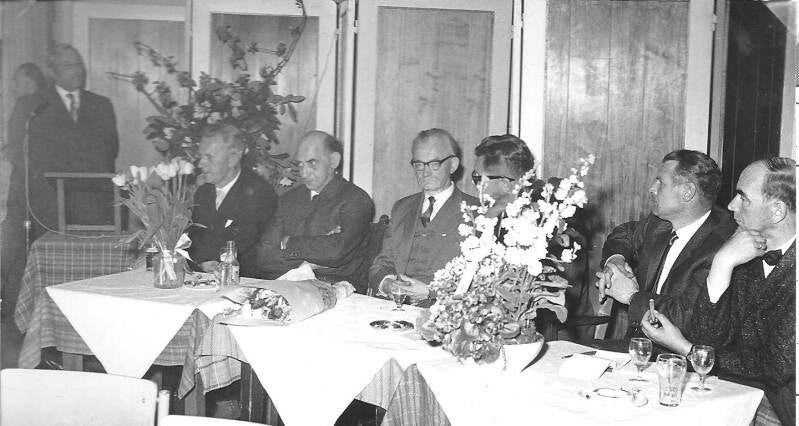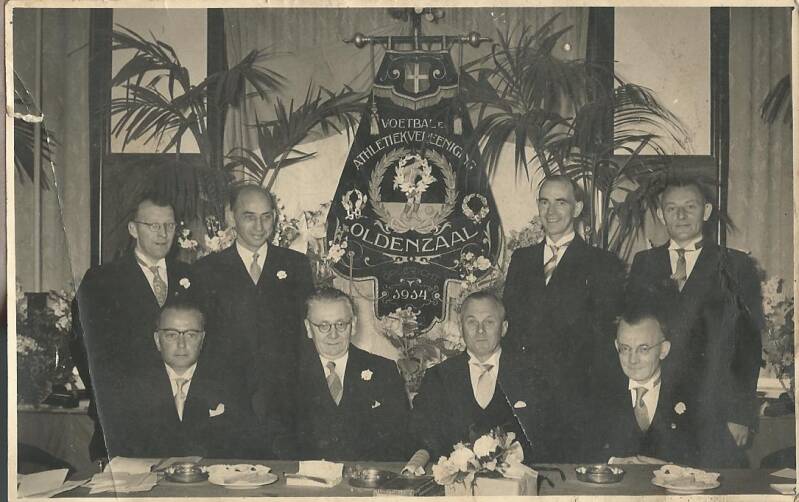 Receptie in bovengenoemd hotel van 15.00 – 17.00 uur. Feestavond in zalen van Roord (nu Rouwhorst) Van links naar rechts: Tonnie Oude Alink, Hennie Lempsink, voorzitter Bakkenes, Gerrit Oosting, Henk Leuwerink en Johan Steenbeeke. Vice-voorzitter KNVB overhandigt de voorzitter een wandbord.