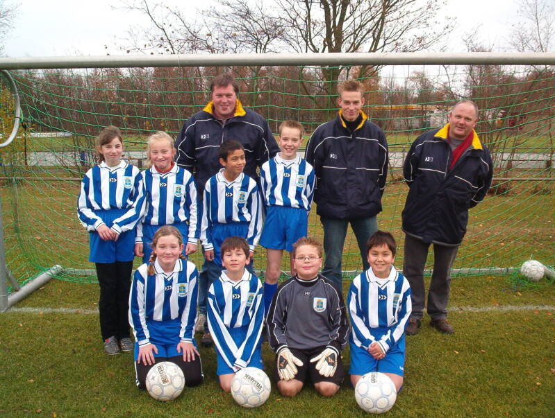 Op de foto het E2 elftal met de leiders Frank Dijkers, Maarten Pool en Sjaak Smits.